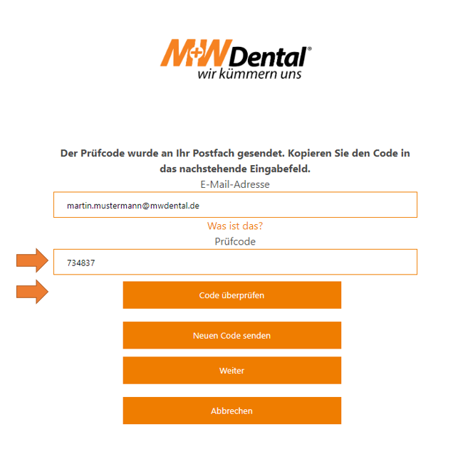 Sie erhalten umgehend per E-Mail einen 6-stelligen Verifizierungscode, den Sie in Ihrem Browser eingeben und mit dem Button Code überprüfen, bestätigen.