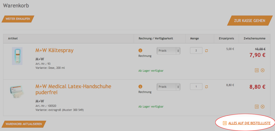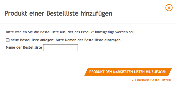 Klicken Sie hierzu ganz einfach auf die Schaltfläche "Alles auf die Bestellliste", die Ihnen angezeigt wird, wenn Sie den Warenkorb geöffnet haben. Sie können diese Bestelllisten jederzeit verändern, ergänzen und löschen.