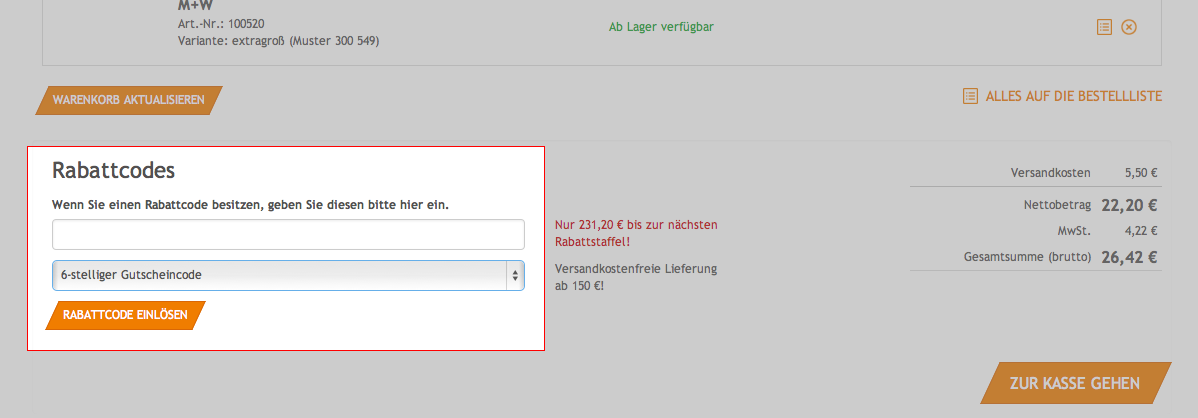 Ihren Gutschein, Ihr Rabattmailing oder den Kennbuchstaben Ihres Sonderkataloges geben Sie am Ende vom Warenkorb ein. Übertragen Sie den Code bitte in das obere Feld und wählen Sie darunter die Codeherkunft aus.