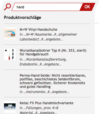 Geben Sie z.B. „Hand“ ein und schon erscheinen: M+W Vinyl Handschuhe, Wurzelkanalbohrer Typ K für Handgebrauch und Perma-Hand-Seide als direkte Vorschläge.