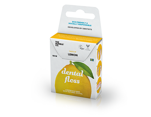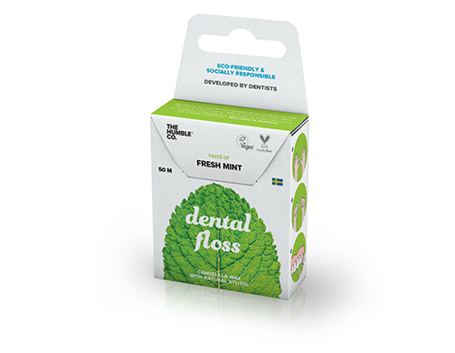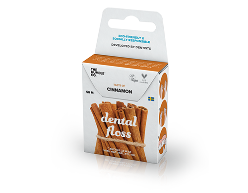 Gewachste Zahnseide mit Xylitol in umweltfreundlicher Kartonverpackung die gleichzeitig auch als praktischer Spender dient. In verschiedenen Geschmacksrichtungen verfügbar, Rolle mit 50 m.