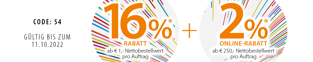 * Bis zum 11.10.2022 erhalten Sie ab einem Nettowarenwert von € 1,- 16% Rabatt auf Alles. Bei Online-Bestellungen erhalten Sie ab einem Nettowarenwert von € 250,- zusätzlich 2% Online-Rabatt. Nur gültig unter Angabe des Rabattcodes 54. Ausgenommen sind M+W Repair & Care Leistungen, CAD/CAM Leistungen, technischer Service, Einrichtungsgeräte sowie nicht rabattierfähige, preisgebundene und vom Hersteller für Aktionen ausgeschlossene Artikel. Die Rabatt-Aktion ist nicht mit anderen Aktionen kombinierbar und schließt unsere üblichen Auftragsrabatte und auch sonstige Sonderrabatte aus. Irrtümer und Änderungen vorbehalten.