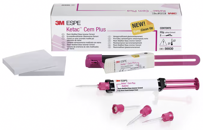 Ketac Cem Plus kunststoffmodifizierter Glasionomer(RMGI)-Zement bietet eine perfekte Kombination aus Komfort und bewährter klinischer Leistung. Mit hoher Haftkraft und praktisch keinen postoperativen Sensitivitäten sorgt er für optimale Ergebnisse bei Routinezementierungen.