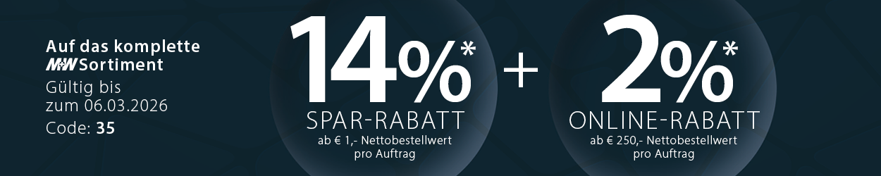 *Bis zum 06.03.2026 erhalten Sie ab dem € 1,- 14% Rabatt auf das gesamte Produktsortiment. Bei Online-Bestellungen erhalten Sie ab einem Nettowarenwert von € 250,- zusätzlich 2% Online-Rabatt.