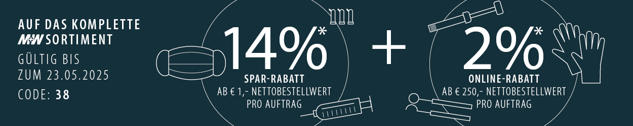 * Bis zum 23.05.2025 erhalten Sie ab dem € 1,- 14% Rabatt auf das gesamte Produktsortiment. Bei Online-Bestellungen erhalten Sie ab einem Nettowarenwert von € 250,- zusätzlich 2% Online-Rabatt.
