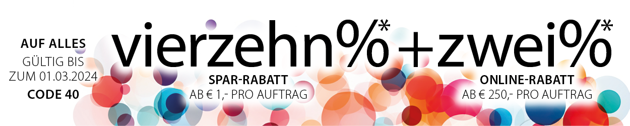 * Bis zum 01.03.2023 erhalten Sie ab dem € 1,- 14% Rabatt auf das gesamte Produktsortiment. Bei Online-Bestellungen erhalten Sie ab einem Nettowarenwert von € 250,- zusätzlich 2% Online-Rabatt.