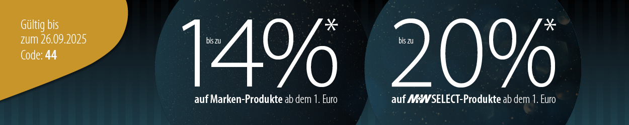 Bis zum 26.09.2025 erhalten Sie ab einem Nettowarenwert von € 1,- 12% Rabatt auf Marken-Produkte und 18% auf alle M+W Select-Produkte. Bei Online-Bestellungen erhalten Sie ab einem Nettowarenwert von € 250,- zusätzlich 2% Online-Rabatt.