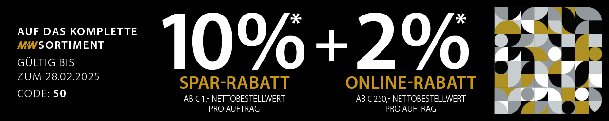 * Bis zum 28.02.2025 erhalten Sie ab einem Nettowarenwert von € 1,- 10% Rabatt auf Alles. Bei Online-Bestellungen erhalten Sie ab einem Nettowarenwert von € 250,- zusätzlich 2% Online-Rabatt. Nur gültig unter Angabe des Rabattcodes 50. Ausgenommen sind CAD/CAM Leistungen, technischer Service, Einrichtungsgeräte sowie nicht rabattierfähige, preisgebundene und vom Hersteller für Aktionen ausgeschlossene Artikel. Die Rabatt-Aktion ist nicht mit anderen Aktionen kombinierbar und schließt unsere üblichen Auftragsrabatte und auch sonstige Sonderrabatte aus. Irrtümer und Änderungen vorbehalten.