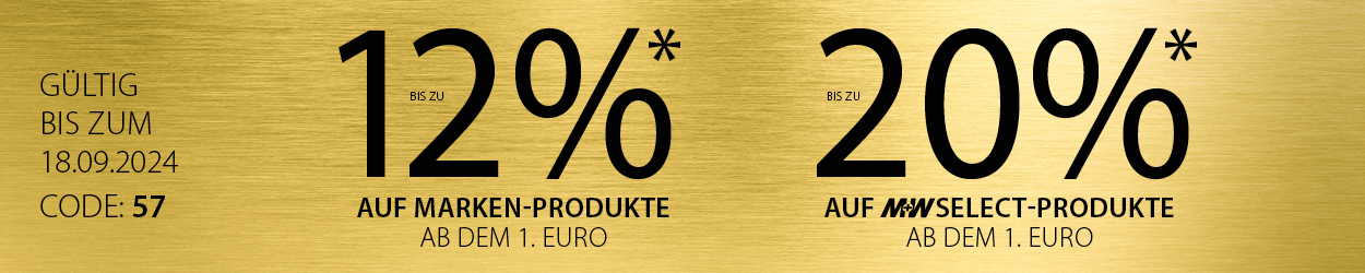 * Bis zum 18.09.2024 erhalten Sie ab einem Nettowarenwert von € 1,- 10% Rabatt auf alle Marken-Produkte und 18% auf das gesamte M+W Select-Sortiment. Bei Online-Bestellungen erhalten Sie ab einem Nettowarenwert von € 250,- zusätzlich 2% Online-Rabatt.
