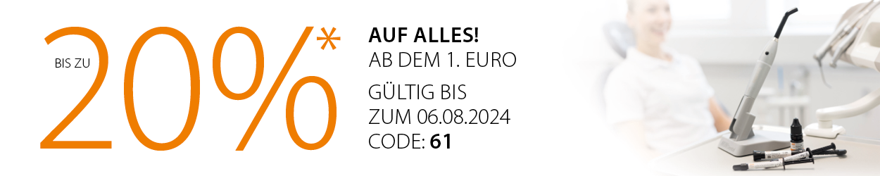 Ausgenommen sind CAD/CAM Leistungen, technischer Service, Einrichtungsgeräte sowie nicht rabattierfähige, preisgebundene und vom Hersteller für Aktionen ausgeschlossene Artikel. Die Rabatt-Aktion ist nicht mit anderen Aktionen kombinierbar und schließt unsere üblichen Auftragsrabatte und auch sonstige Sonderrabatte aus.