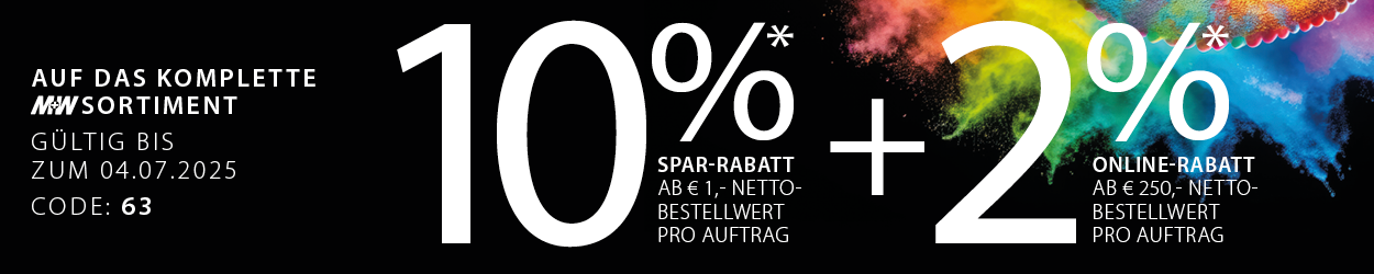 * Bis zum 04.07.2025 erhalten Sie ab einem Nettowarenwert von € 1,- 10% Rabatt auf Alles. Bei Online-Bestellungen erhalten Sie ab einem Nettowarenwert von € 250,- zusätzlich 2% Online-Rabatt. Nur gültig unter Angabe des Rabattcodes 63. Ausgenommen sind CAD/CAM Leistungen, technischer Service, Einrichtungsgeräte sowie nicht rabattierfähige, preisgebundene und vom Hersteller für Aktionen ausgeschlossene Artikel. Die Rabatt-Aktion ist nicht mit anderen Aktionen kombinierbar und schließt unsere üblichen Auftragsrabatte und auch sonstige Sonderrabatte aus. Irrtümer und Änderungen vorbehalten.