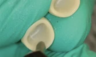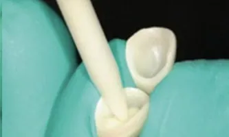 Nach der Einprobe wird die Innenseite der Krone mit 30 oder 50 μm Aluminiumoxid mit einem Druck von 2 bar gestrahlt, um eine matte Oberfläche zu erhalten. Wenn die Krone vom Labor sandgestrahlt wurde, nach der Einprobe mit fünfprozentiger Natriumhypochloritlösung reinigen, mit Wasser abspülen und lufttrocknen
