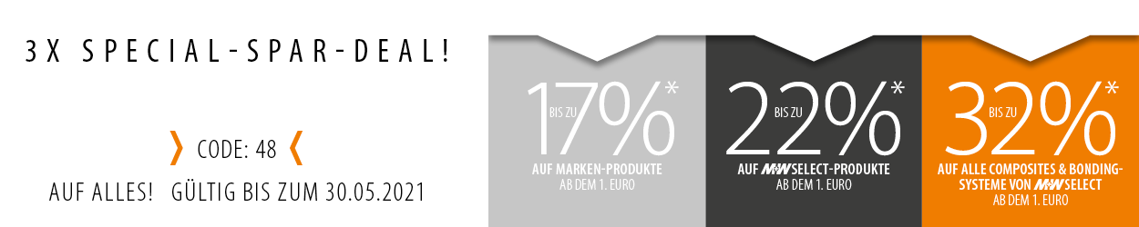 * Bis zum 30.05.2021 erhalten Sie ab dem € 1,- 15% Rabatt auf das gesamte Produktsortiment, 20% Rabatt auf M+W Select Produkte und 30% auf M+W Select Composits & Bonding-Systeme. Für Onlinebestellungen ab einem Nettowarenwert von € 250,- erhalten Sie zusätzlich 2% Online-Rabatt. Nur gültig unter Angabe des Rabattcodes 48. Ausgenommen sind M+W Repair & Care Leistungen, CAD/CAM Leistungen, technischer Service, Einrichtungsgeräte sowie nicht rabattierfähige, preisgebundene und vom Hersteller für Aktionen ausgeschlossene Artikel. Die Rabatt-Aktion ist nicht mit anderen Aktionen kombinierbar und schließt unsere üblichen Auftragsrabatte und auch sonstige Sonderrabatte aus. Irrtümer und Änderungen vorbehalten.