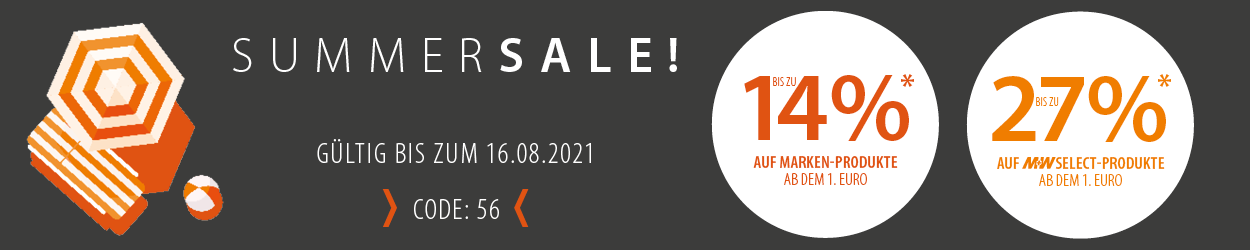 * Bis zum 16.08.2021 erhalten Sie ab dem € 1,- 12% Rabatt auf alle Marken-Produkte und 25% Rabatt auf alle M+W Select-Produkte. Für Onlinebestellungen ab einem Nettowarenwert von € 250,- erhalten Sie zusätzlich 2% Online-Rabatt.